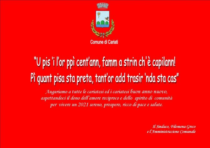 Auguriamo a tutte le cariatesi ed i cariatesi – conclude la Greco nella sua lettera – buon anno nuovo ed “u pis ‘i l’or ppì cent’ann” alla nostra bella ed amata Cariati, aspettandoci ciascuno in cambio il dono dell’amore reciproco e dello spirito di comunità per vivere un 2021 sereno, prospero, ricco di pace e salute (Comunicato stampa).