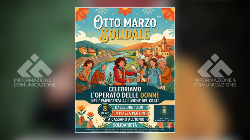 CASSANO ALLO IONIO – In occasione della Giornata Internazionale della Donna, l’Amministrazione comunale di Cassano allo Ionio promuove un’iniziativa dedicata al ruolo delle donne durante la recente emergenza legata all’alluvione del fiume Crati. L’appuntamento è fissato per sabato 8 marzo alle ore 10.30 in Piazza Pertini.