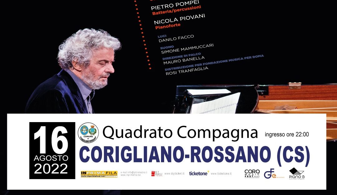 CORIGLIANO-ROSSANO – Il concerto al Quadrato Compagna, previsto originariamente per la serata del 10 agosto 2022, è stato spostato al 16 agosto 2022, con inizio alle ore 22.