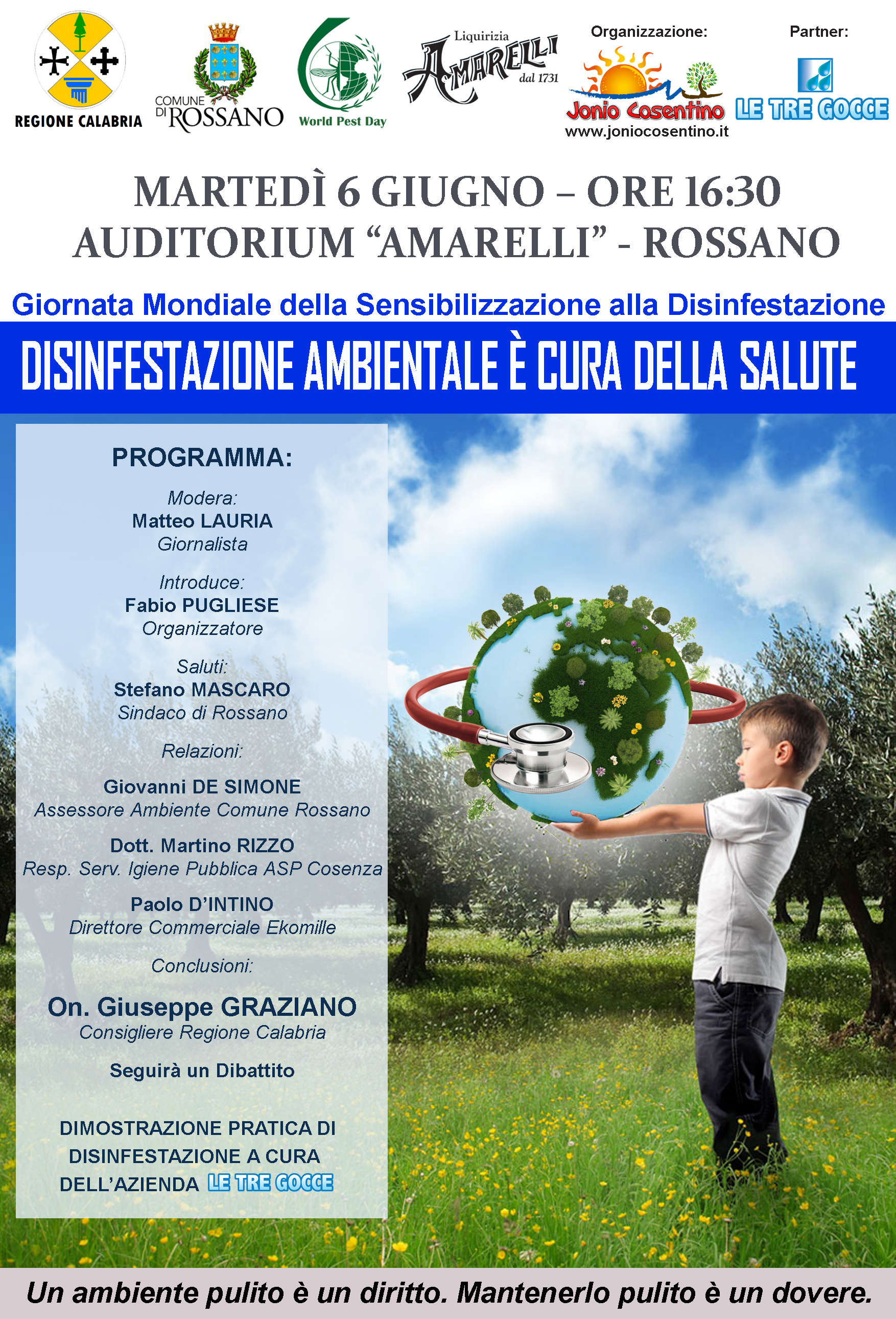 Il Convegno dal titolo “Disinfestazione Ambientale è Cura della Salute”, previsto per martedì 6 giugno alle ore 17:00 presso l’Auditorium Amarelli di Rossano, ha l’obiettivo di aprire un confronto sule varie tipologie di disinfestazione ambientale e sulla loro importanza circa i benefici che queste pratiche di prevenzione hanno per la salute degli esseri umani.