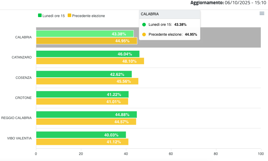 Cosenza – 6 ottobre 2025 – Si è conclusa alle ore 15.00 la rilevazione sull’affluenza per le elezioni regionali in Calabria 2025. I dati forniti dal sito Eligendo del Ministero dell’Interno mostrano un’affluenza complessiva nella regione che si attesta al 43,13%.