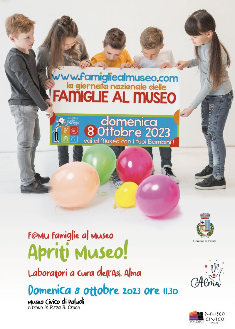 Sarà un museo generoso di voci, sorrisi, colori, attività, laboratori, conoscenza del territorio e di civiltà passate quello che domenica 8 ottobre mattina accoglierà le bambine ed i bambini che, con i propri cari, vorranno trascorrere l’edizione 2023 di F@MU Famiglie al Museo al Museo Civico di Paludi (CS).
