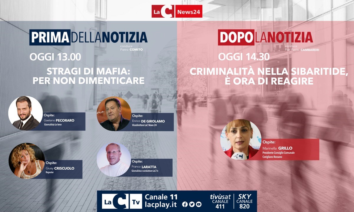 A trent’anni dalle stragi di mafiaperchè non dobbiamo dimenticare. Partirà da qui la nuova puntata di Prima della notizia, il format condotto da Pietro Comito in onda a partire dalle 13 su LaC. In collegamento da Palermo dove è in corso il Memorial day la giornalista Giusy Criscuolo. In collegamento anche Gaetano Pecoraro, giornalista delle Iene e Franco Laratta, giornalista e conduttore di LaC. In studio il vicedirettore Enrico De Girolamo.