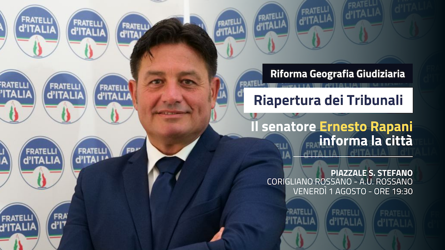 Venerdì 1° agosto alle 19,30, il senatore incontra i cittadini in piazza S. Stefano: focus sulla riforma della geografia giudiziaria  –  La riforma della geografia giudiziaria torna al centro dell’attenzione. Venerdì 1° agosto, alle ore 19,30 in piazzale Santo Stefano, il senatore Ernesto Rapani incontrerà la cittadinanza per fare chiarezza sul percorso normativo avviato dal Governo. Un’informativa precisa: si parlerà di come si sta intervenendo sul riordino degli uffici giudiziari e di quali siano i margini per correggere le scelte del passato. Al centro, il destino delle sedi soppresse e le ricadute per territori. L’appuntamento intende offrire un quadro aggiornato, alla luce dei lavori previsti nelle Commissioni parlamentari chiamate ad analizzare gli aspetti salienti delle realtà giudiziarie penalizzate. Rapani illustrerà i contenuti della proposta di riforma e le posizioni emerse a livello istituzionale.