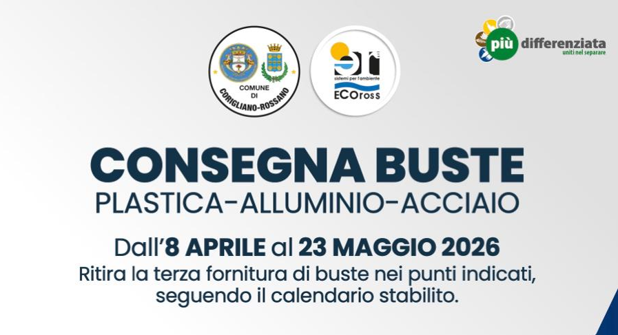 CORIGLIANO-ROSSANO – Partirà mercoledì prossimo 8 aprile e proseguirà fino a sabato 23 maggio la distribuzione della terza fornitura di buste per la raccolta...